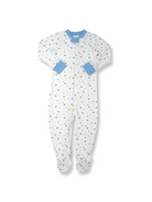 Sweet Dreams Little One! A long sleeve footie in our custom Lullaby Set football print with blue trim. A full front zip closure for easy changing and grippers on the bottom of foot.