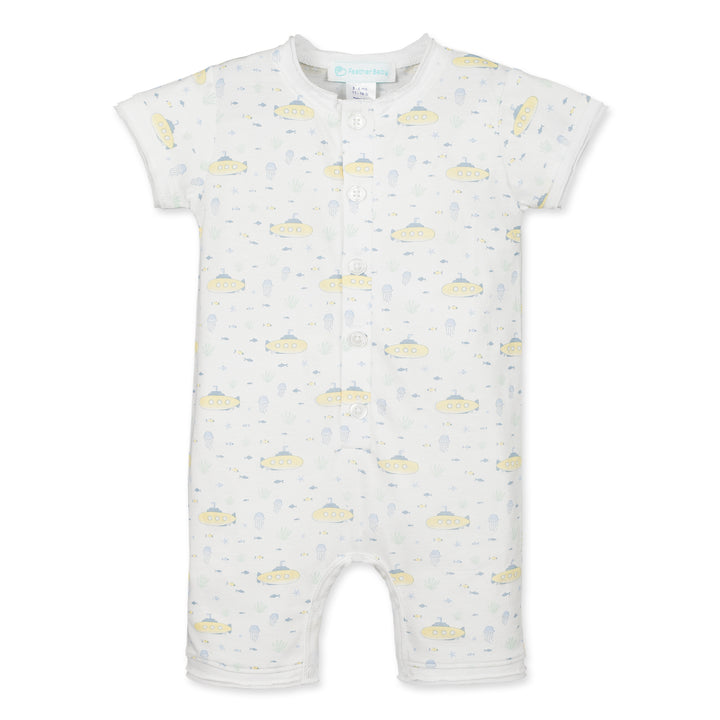 Our relaxed and sporty Henley Romper has all the makings for a little one who loves to romp. A soft, lightweight jersey makes this perfect for summer days! Rough hems along the cuffs and collar give this bestselling piece a casual, beachy feel. Buttons up front and snaps along the inseam.