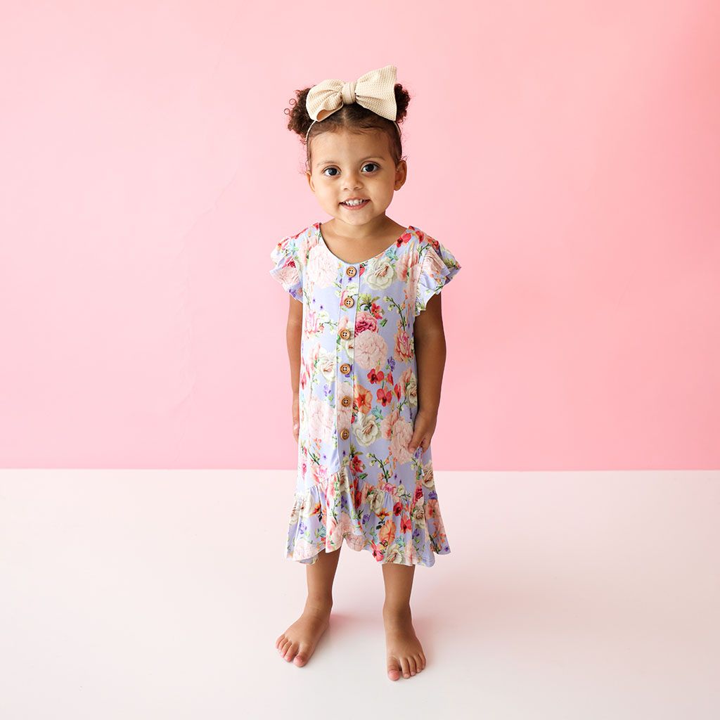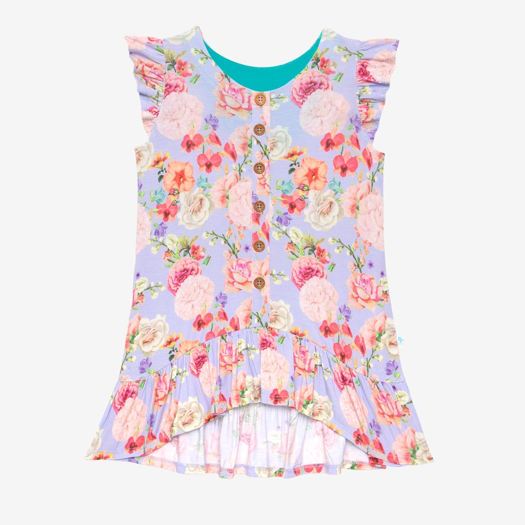 Twirl in our coveted hi-low dresses with ruffle cap sleeves and henley signature wood Posh Peanut® buttons. This loose-fitting girl's dress is perfect for all ages. Featuring a beautiful hi-low ruffle trim, ruffle sleeves, wood buttons, and signature teal lining. Papook® viscose from bamboo is ultra-soft and great for wearing all day. Layer it with leggings, jean jackets, or wear it as a tunic.