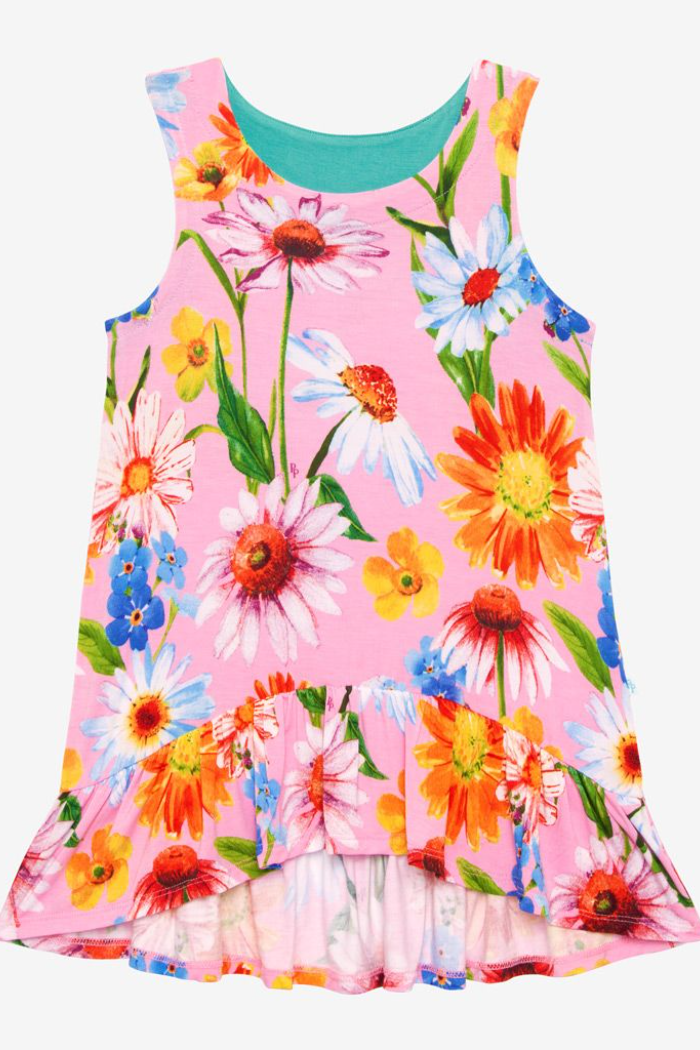 A dress is a feminine, sweet garment that your little girl's closet should never be without. Twirl in our coveted hi-low dresses made for comfort without compromising style. This loose-fitting girls' dress is perfect for all ages featuring a beautiful hi-low ruffle trim and signature teal lining. Papook® viscose from bamboo is ultra-soft and great for wearing all day. Layer it with leggings, jean jackets, or wear it as a tunic.