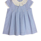 Short Sleeved Light Denim Dress with a white ruffled collar. Adorned with five pearls