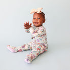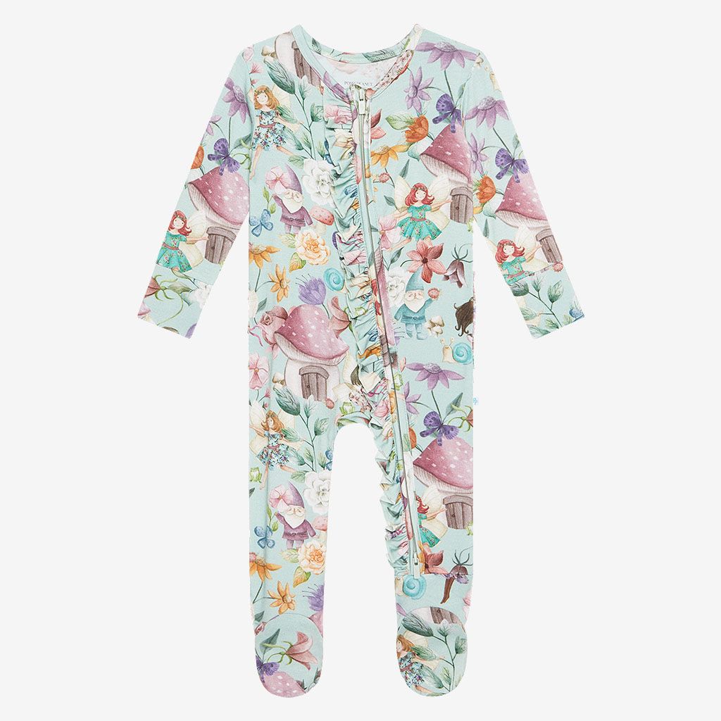 Reimagine your essentials in our coveted girls ruffled footie reversible zippered one-piece in Päpook® viscose from bamboo. Ultra-soft viscose makes our footies the perfect addition to everyday wear. Ruffle detail on bodice and layers of ruffle on the back for a cute added detail—Posh Peanut® signature non-slip grips on the footie for walkers. The reversible 2-way zipper makes diaper changes quick and easy without undressing your baby down. Elastic backing on footies for a snug fit, built-in fold-over mittens in sizes NB and 0-3M. Jammies so cute you can wear them out!