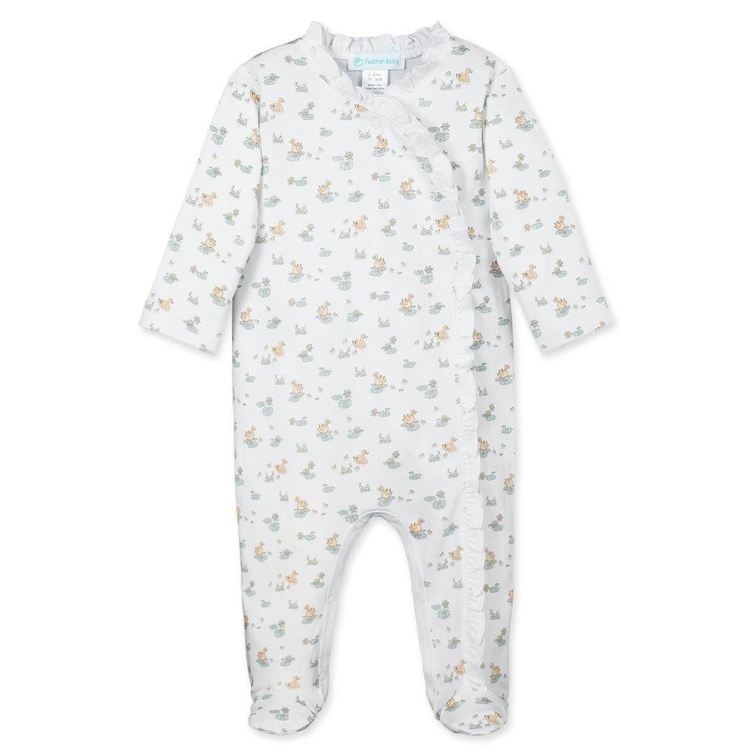 With a head-to-toe ruffle, our kimono-style footie is top-to-bottom sweetness and softness. Medium weight interlock knit provides just the right amount of warmth. Snaps are in front along the shoulders and along the inseam.