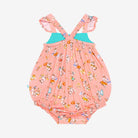Ruffle cap sleeve bubble rompers are the perfect outfit for any occasion. Päpook® viscose from bamboo, breathable, lightweight, and oh so cute! Ruffle details on straps with signature teal lining. Stretchy elastic in back to adjust as your peanut grows, comfortable, and makes for the perfect warm-weather outfit.
