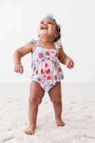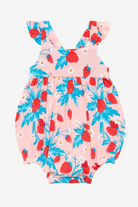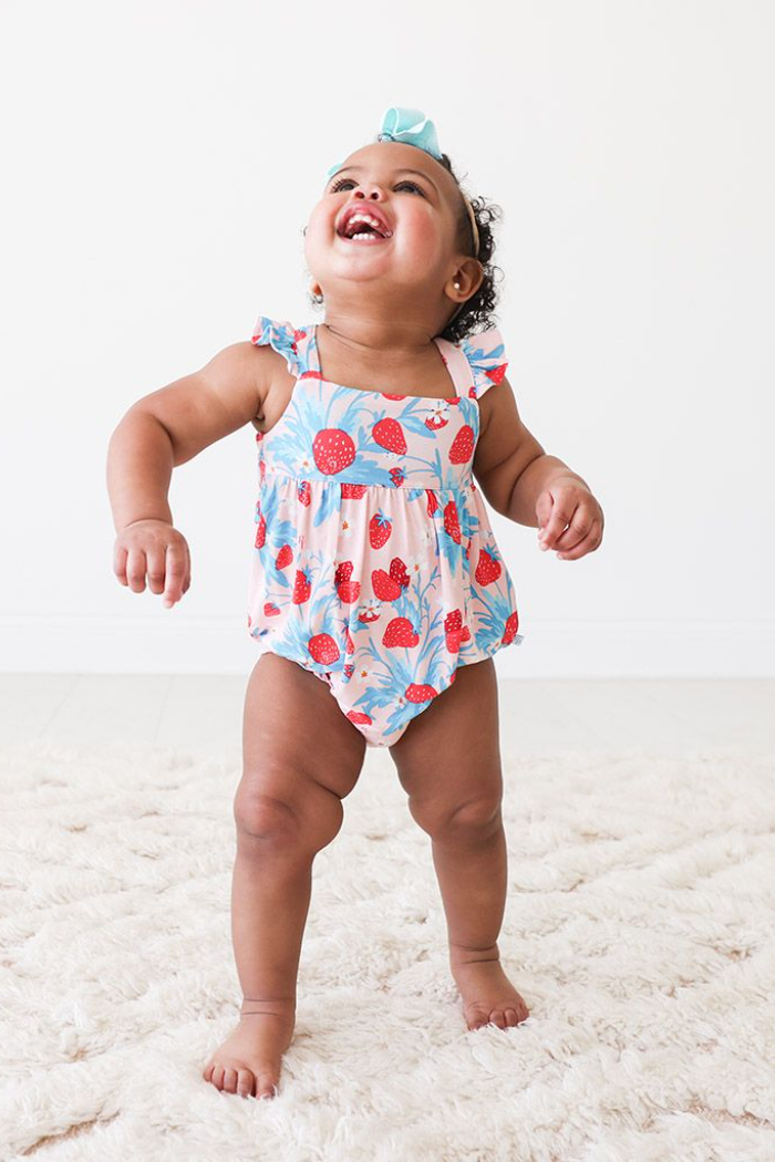 Our new bubble romper with a scoop neckline and ruffled cap sleeves in our signature Strawberry design! Comes with inseam snaps for an easy diaper change and is made from our coveted Päpook® viscose from bamboo for extra comfort and all-day wear.