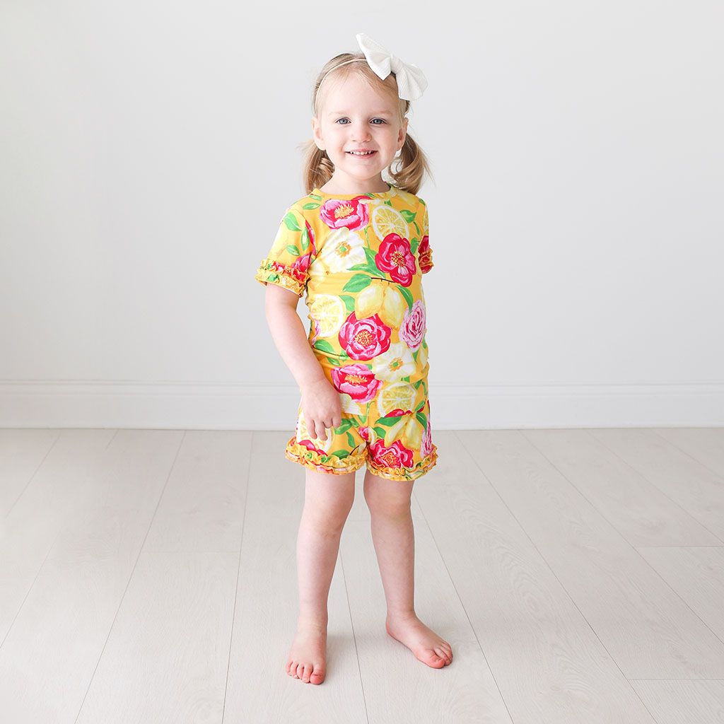 Breathable, stretchy, lightweight, and buttery soft, our Päpook® viscose from bamboo micro ruffle short sleeve shorts pajamas are a must-have for all children. Moisture-wicking bamboo is excellent for children who may overheat at night. A favorite amongst all ages, pajamas so cute they aren't just for sleeping! Mix and match with your favorite apparel from Posh Peanut®.