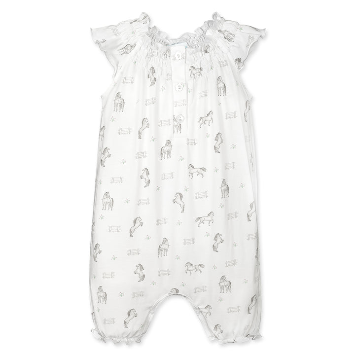 A nod to warmer weather, our Angel-Sleeve Romper is sweet, lightweight, and modern. With elastic smocked into the collar by hand, it stretches easily over a baby's head. Flitty angel-style sleeves and flower-shaped buttons give this special outfit a feminine touch. Snaps along the inseam.