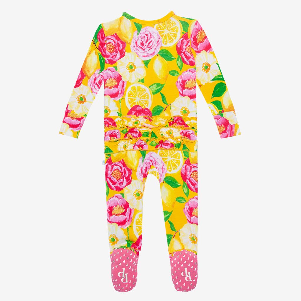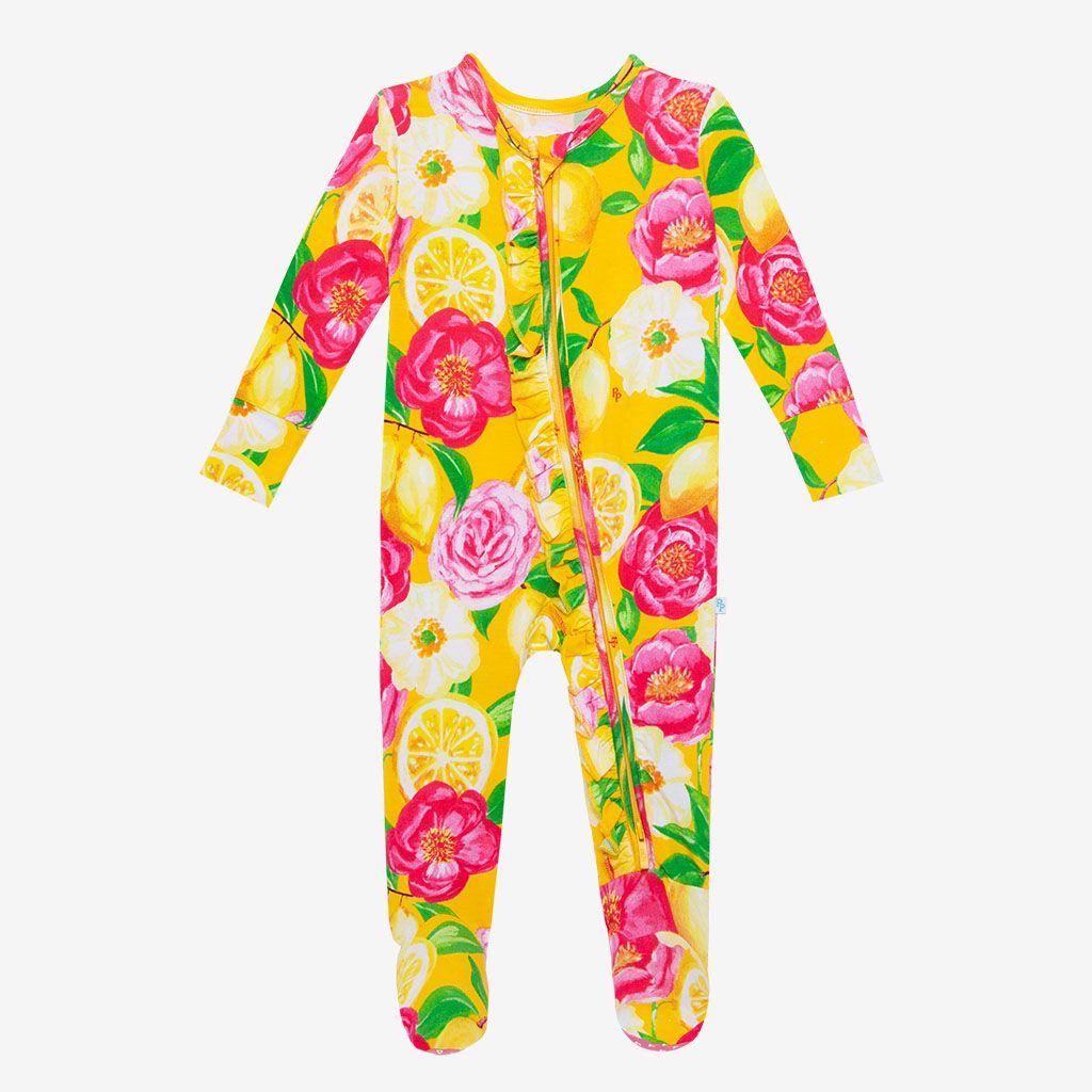Reimagine your essentials in our coveted girls ruffled footie reversible zippered one-piece in Päpook® viscose from bamboo. Ultra-soft viscose makes our footies the perfect addition to everyday wear. Ruffle detail on bodice and layers of ruffle on the back for a cute added detail—Posh Peanut® signature non-slip grips on the footie for walkers. The reversible 2-way zipper makes diaper changes quick and easy without undressing your baby down. Elastic backing on footies for a snug fit, built-in fold-over mittens in sizes NB and 0-3M. Jammies so cute you can wear them out!