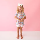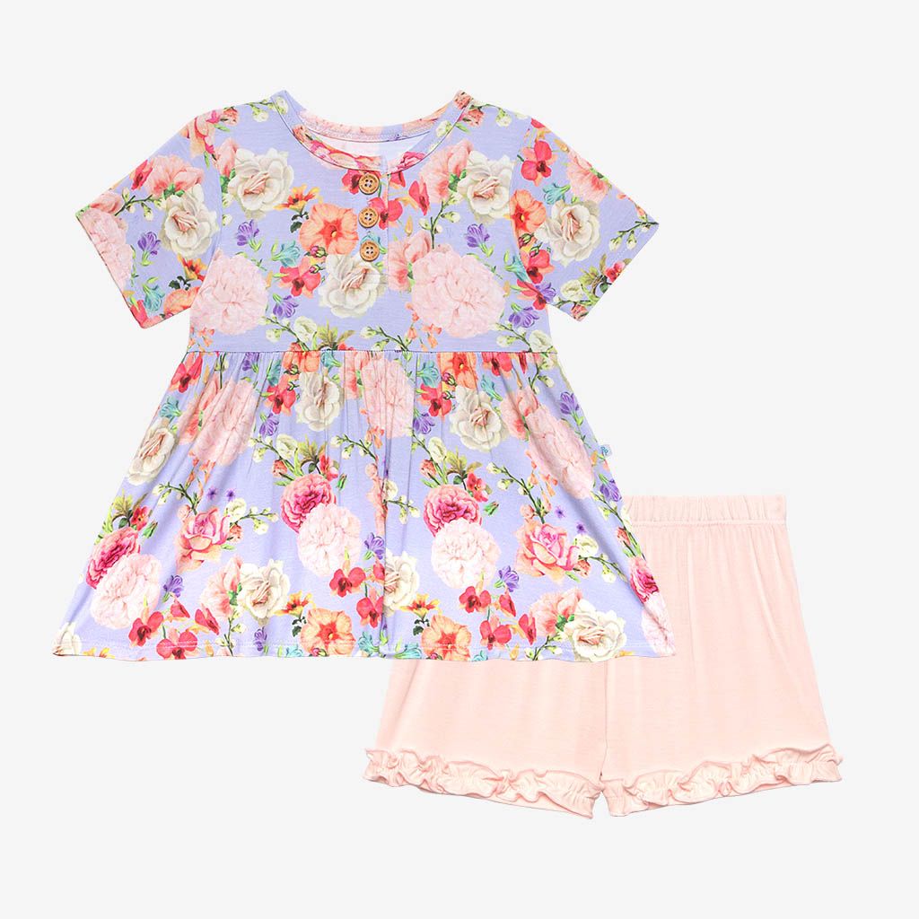 Short sleeve peplum top with scoop neckline and ruffled shorts in our Päpook® viscose from bamboo. This 2-piece set is breathable and stretchy, making it the perfect warm-weather outfit. Mix and match with your favorite apparel from Posh Peanut®.
