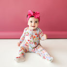 Reimagine your essentials in our coveted girls ruffled footie reversible zippered one-piece in Päpook® viscose from bamboo. Ultra-soft viscose makes our footies the perfect addition to everyday wear. Ruffle detail on bodice and layers of ruffle on the back for a cute added detail—Posh Peanut® signature non-slip grips on the footie for walkers. The reversible 2-way zipper makes diaper changes quick and easy without undressing your baby down. Elastic backing on footies for a snug fit, built-in fold-over mittens in sizes NB and 0-3M. Jammies so cute you can wear them out!