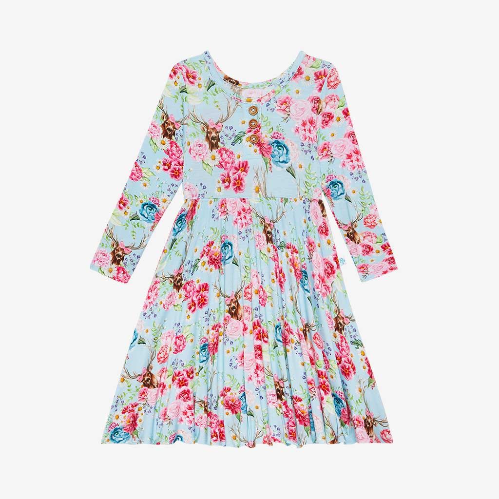 Girl twirl dresses in our signature Päpook® viscose from bamboo. Our twirl dresses are perfectly designed to be comfortable yet show-stopping: long sleeves, scoop neck, and functional wood buttons. Extra twirly and daughter approved! Great for all occasions—pair it with a jean jacket, leggings, or mix/match with many of our collections.