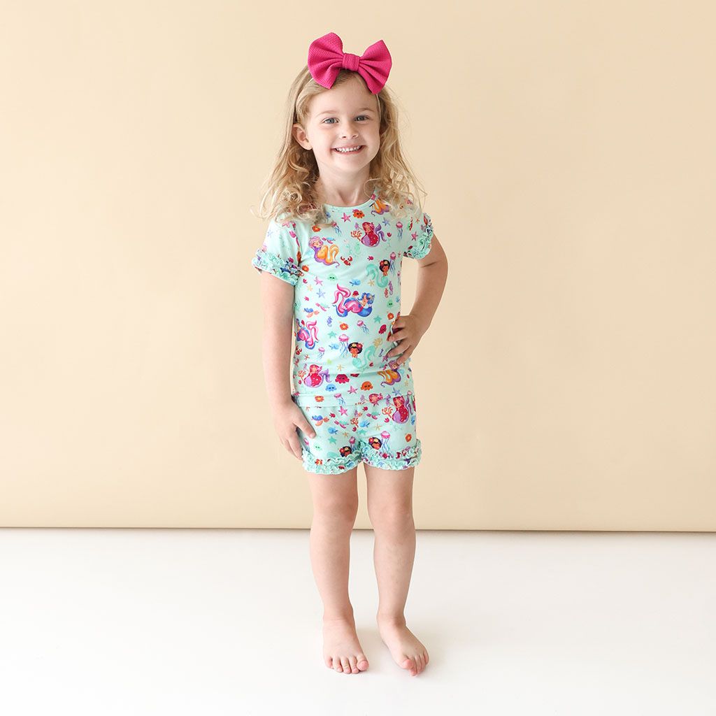 Breathable, stretchy, lightweight, and buttery soft, our Päpook® viscose from bamboo micro ruffle short sleeve shorts pajamas are a must-have for all children. Moisture-wicking bamboo is excellent for children who may overheat at night. A favorite amongst all ages, pajamas so cute they aren't just for sleeping! Mix and match with your favorite apparel from Posh Peanut®.