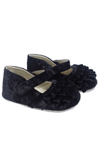 Black crushed velvet ruffle Mary Jane with silver shimmer suede sole and hook and loop strap. Flexible soles and cushioned foam insoles provide protection and comfort for stay on, play on power.