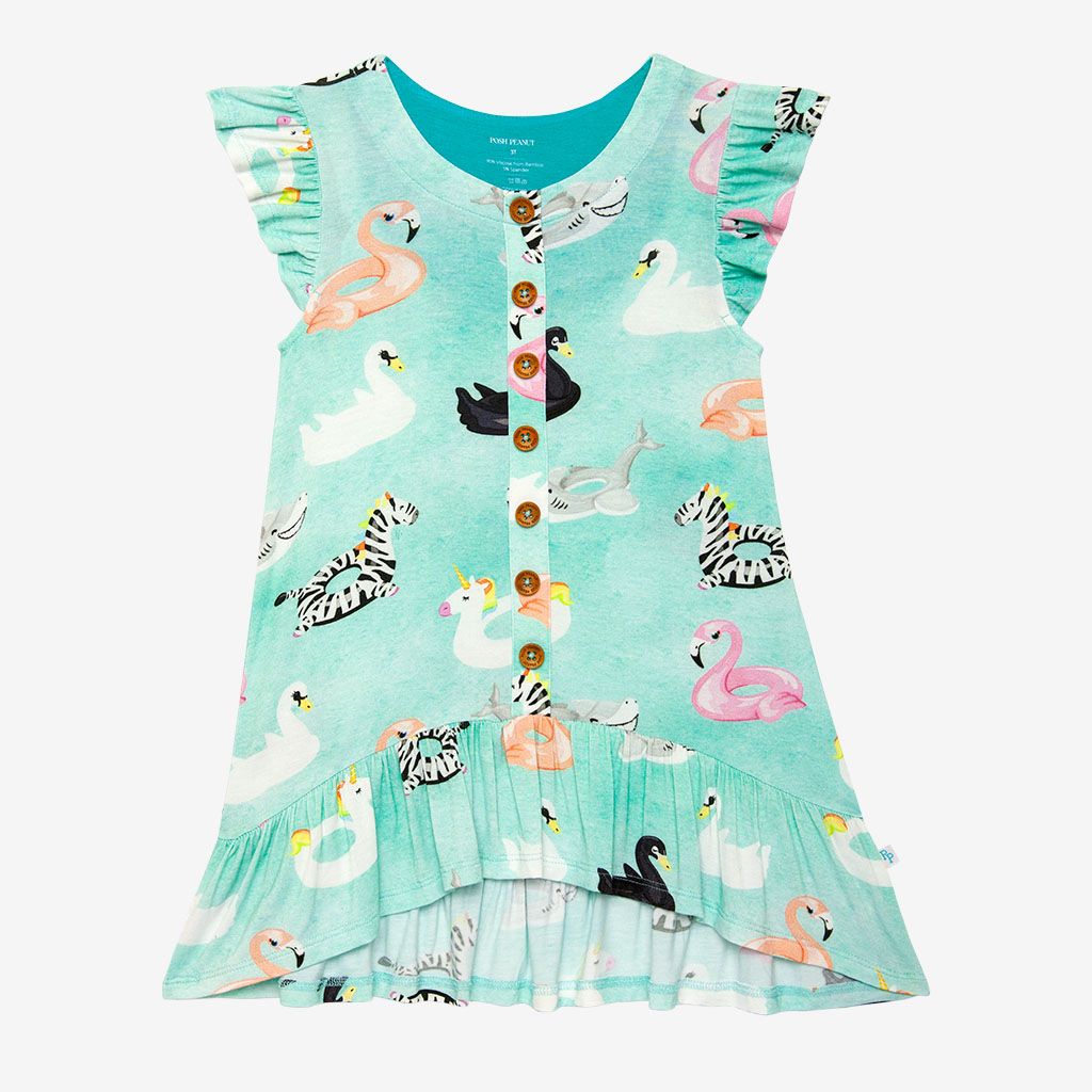 Twirl in our coveted hi-low dresses with ruffle cap sleeves and henley signature wood Posh Peanut® buttons. This loose-fitting girl's dress is perfect for all ages. Featuring a beautiful hi-low ruffle trim, ruffle sleeves, wood buttons, and signature teal lining. Papook® viscose from bamboo is ultra-soft and great for wearing all day. Layer it with leggings, jean jackets, or wear it as a tunic.