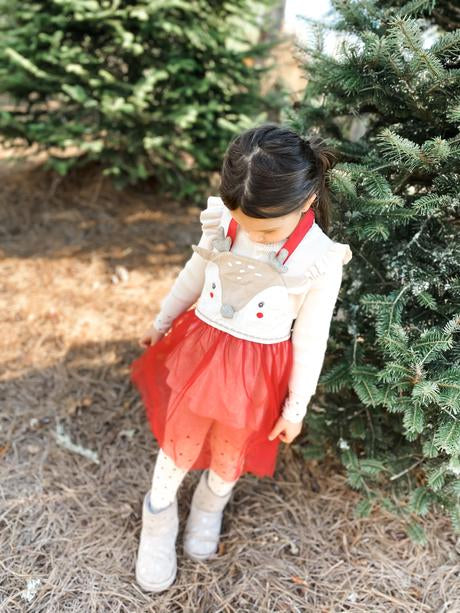 This is no ordinary apron! Made of linen and organza, this bunny apron has linen ties and with velcro closure and ties around the waist. Beautiful for Christmas tea time, and play, the organza skirt makes this fit for a holiday princess!