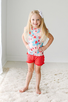 Ruffled cap sleeve top with henley neckline and ruffled varsity shorts in our Päpook® viscose from bamboo. This 2-piece set is breathable and stretchy, making it the perfect warm-weather outfit. Mix and match with your favorite apparel from Posh Peanut®.