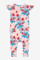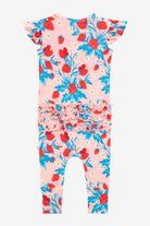 Strawberry ruffled cap sleeve romper with henley neckline and snaps for an easy diaper change. Made from our coveted lux viscose from bamboo for extra comfort and all-day wear!