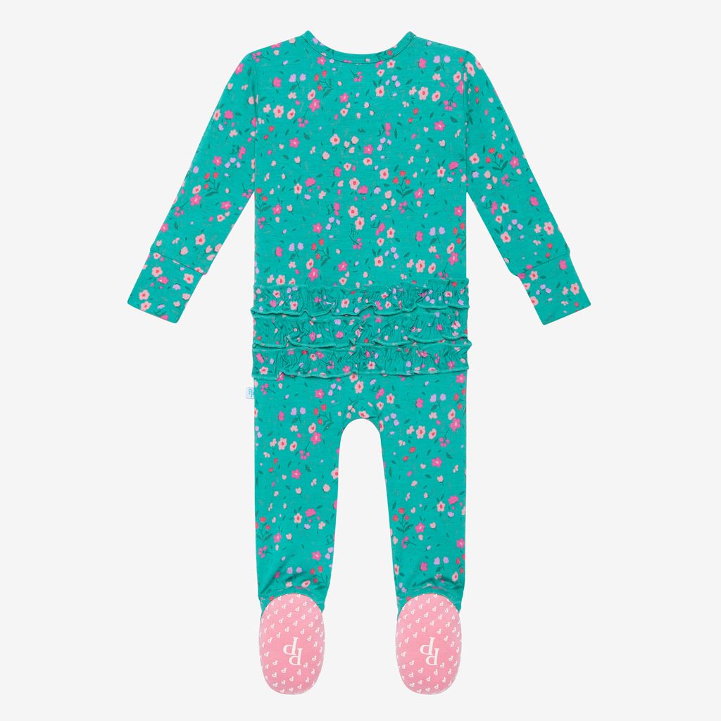 Reimagine your essentials in our coveted girls ruffled footie reversible zippered one-piece in Päpook® viscose from bamboo. Ultra-soft viscose makes our footies the perfect addition to everyday wear. Ruffle detail on bodice and layers of ruffle on the back for a cute added detail—Posh Peanut® signature non-slip grips on the footie for walkers. The reversible 2-way zipper makes diaper changes quick and easy without undressing your baby down. Elastic backing on footies for a snug fit, built-in fold-over mittens in sizes NB and 0-3M. Jammies so cute you can wear them out!
